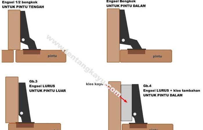 - Lurus / Setengah Bungkuk / Full Bungkuk: Merupakan istilah untuk bentuk lengkungan pada batang engsel. Lurus tidak memiliki lengkungan, Setengah Bungkuk memiliki lengkungan sebagian, dan Full Bungkuk memiliki lengkungan penuh. Pemilihan tipe disesuaikan dengan desain dan kebutuhan jarak bukaan pintu furniture.