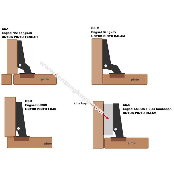 - Lurus / Setengah Bungkuk / Full Bungkuk: Merupakan istilah untuk bentuk lengkungan pada batang engsel. Lurus tidak memiliki lengkungan, Setengah Bungkuk memiliki lengkungan sebagian, dan Full Bungkuk memiliki lengkungan penuh. Pemilihan tipe disesuaikan dengan desain dan kebutuhan jarak bukaan pintu furniture.