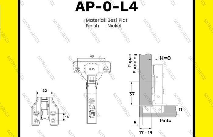 - Lurus / Setengah Bengkok / Full Bengkok: Merujuk pada bentuk lengan engsel. Lurus untuk aplikasi standar, sementara yang bengkok (dengan offset 8mm atau 16mm) digunakan untuk menyesuaikan posisi pintu atau laci terhadap panel kabinet, memberikan fleksibilitas dalam desain.