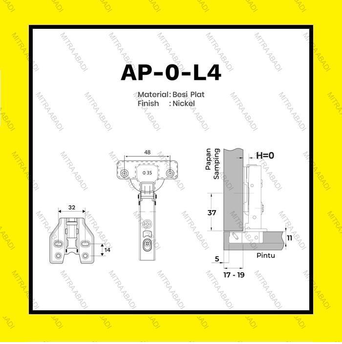 - Lurus / Setengah Bengkok / Full Bengkok: Merujuk pada bentuk lengan engsel. Lurus untuk aplikasi standar, sementara yang bengkok (dengan offset 8mm atau 16mm) digunakan untuk menyesuaikan posisi pintu atau laci terhadap panel kabinet, memberikan fleksibilitas dalam desain.