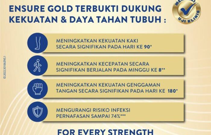 Nikmati hidup yang lebih kuat dan aktif setiap hari dengan Ensure Gold, solusi nutrisi dewasa yang diformulasikan khusus dengan HMB. Diperkaya dengan kombinasi nutrisi unggulan untuk membantu menjaga kekuatan dan kesehatan tubuh secara optimal, terutama untuk Anda yang ingin tetap produktif.