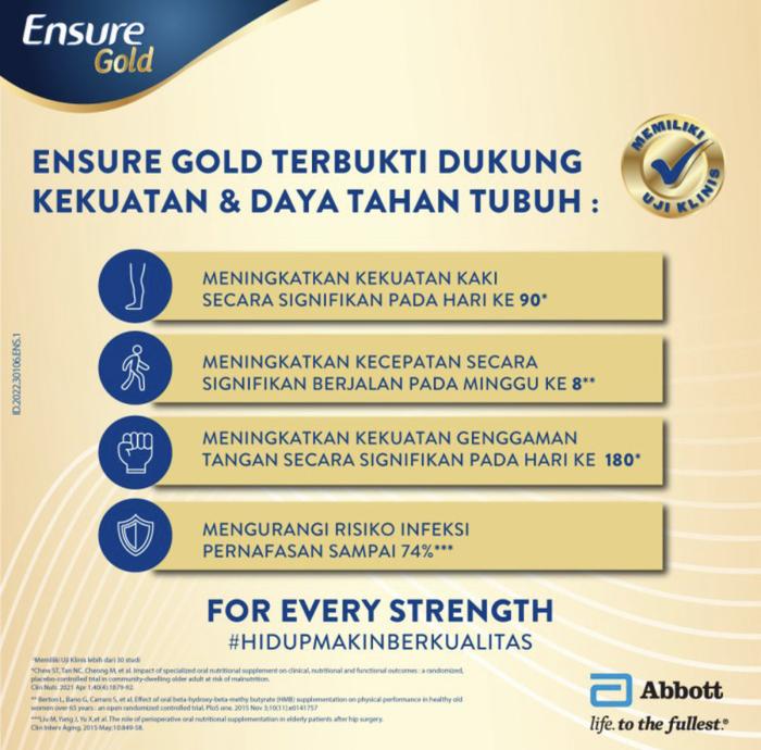 Nikmati hidup yang lebih kuat dan aktif setiap hari dengan Ensure Gold, solusi nutrisi dewasa yang diformulasikan khusus dengan HMB. Diperkaya dengan kombinasi nutrisi unggulan untuk membantu menjaga kekuatan dan kesehatan tubuh secara optimal, terutama untuk Anda yang ingin tetap produktif.