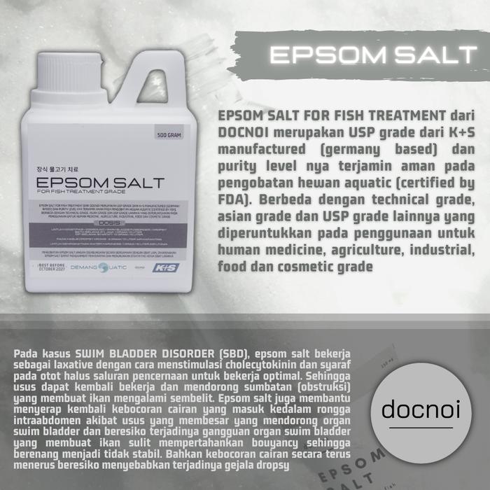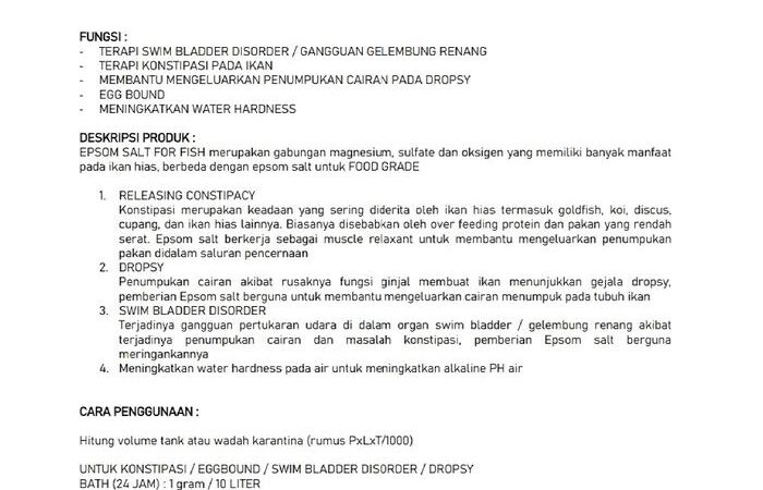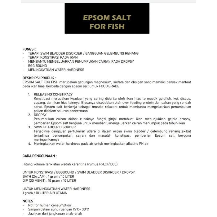 Epsom Salt for Fish diformulasikan khusus untuk akuatik dan berbeda dengan versi food grade untuk manusia. Kandungan magnesium sulfat bekerja sebagai laxatif alami, merangsang kontraksi usus, dan membantu penyerapan cairan berlebih. Aman digunakan untuk ikan cupang, koi, goldfish, discus, dan ikan hias lainnya dalam terapi jangka panjang.