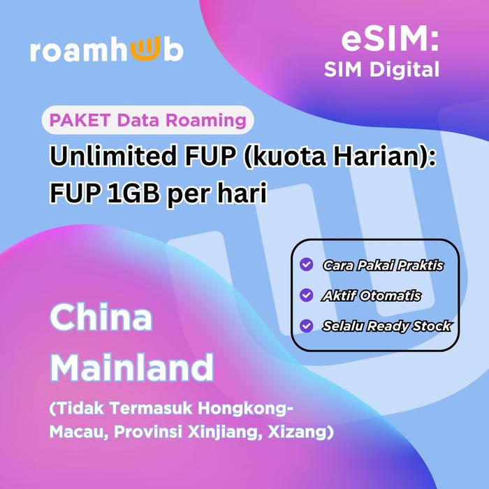 Nikmati koneksi internet tanpa batas di China Mainland (tidak termasuk Xinjiang, Xizang/Tibet, dan daerah Uyghur) dengan eSIM digital praktis.