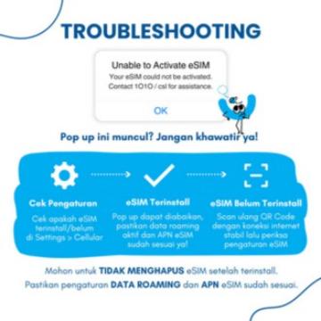 - Masa aktif eSIM sebelum dipindai: 30 hari sejak diterbitkan. Jika tidak dipindai, eSIM kadaluarsa.