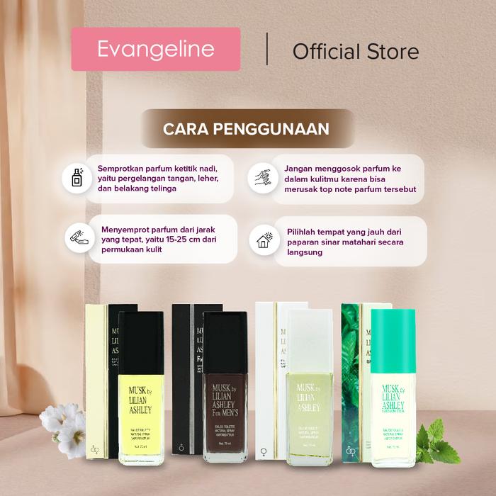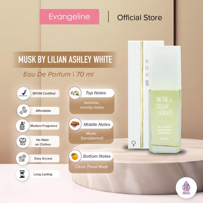 Hadirkan kesan elegan dan memikat dengan Evangeline Perfume Musk By Lilian Ashley. Parfum Eau De Toilette klasik ini dirancang khusus untuk wanita modern yang menghargai wewangian timeless dengan performa tahan lama. Aroma musk yang hangat dan sensual menjadi karakter utama, dipadukan sempurna dengan keharuman manis dan feminin dari bunga melati. Wanginya yang sophisticated cocok menemani Anda beraktivitas dari pagi hingga malam, memberikan aura percaya diri dan daya tarik yang tak terbantahkan.