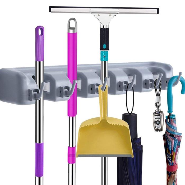 | Kapasitas Penyimpanan Maksimal | Memiliki 5 slot utama untuk menyelipkan gagang sapu, pel, atau alat lainnya serta 6 hook untuk gantung lap. |