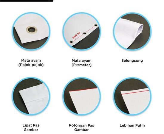 - Mata Ayam: Finishing berupa lubang-lubang di pinggir spanduk yang berfungsi untuk mengikat atau memasang spanduk dengan mudah.