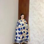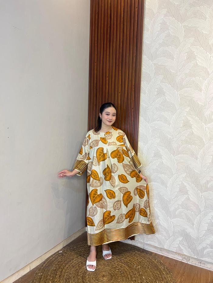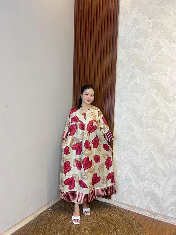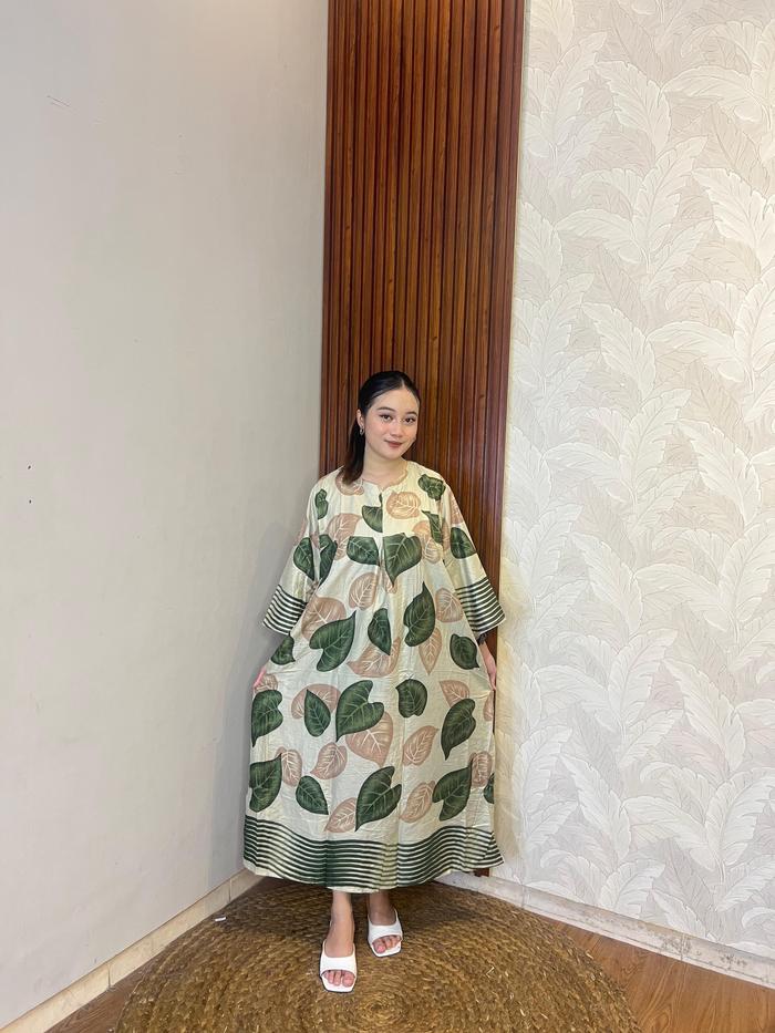 | Desain & Motif Eksklusif | Menampilkan motif daun yang artistik dan trendi, memberikan kesan ceria dan elegan secara bersamaan. Lengan lonceng (bell sleeve) 3/4 mempermanis siluet tubuh. |