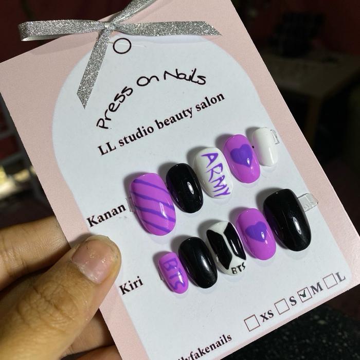 Dapatkan kuku palsu dengan desain BTS yang lucu dan stylish! Setiap pembelian sudah termasuk lem gel gratis agar pemasangan lebih mudah dan tahan lama. Nikmati juga layanan custom size dengan pilihan XS, S, M, dan L untuk menyesuaikan bentuk kuku Anda secara sempurna.