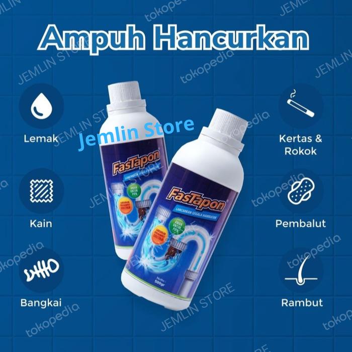 Hanya dalam hitungan menit, saluran mampet di rumah Anda akan lancar kembali! FasTapon Anti Sumbat bekerja dengan cepat menghancurkan sumbatan membandel, mulai dari sisa makanan, lemak, minyak, rambut, pembalut, hingga bangkai tikus.