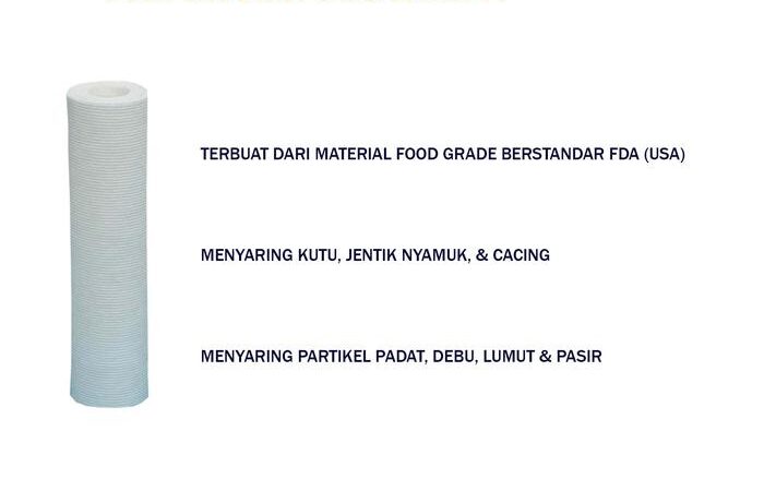 - PP Spun (Polypropylene Spun): Jenis filter mekanis yang terbuat dari serat polypropylene yang dipintal, berfungsi menyaring partikel padat dalam air.