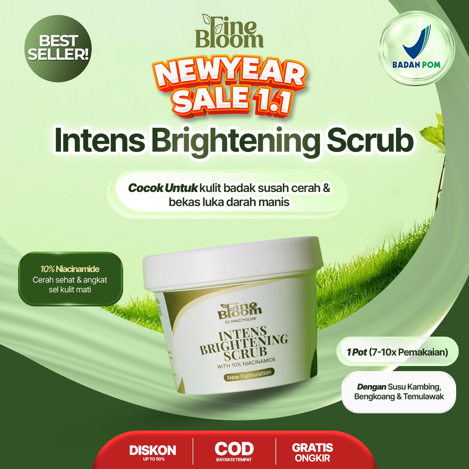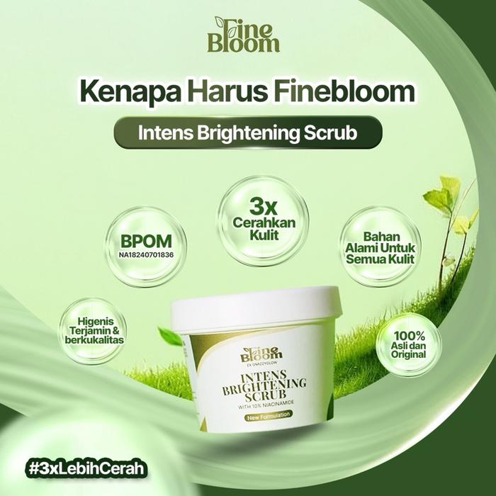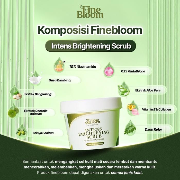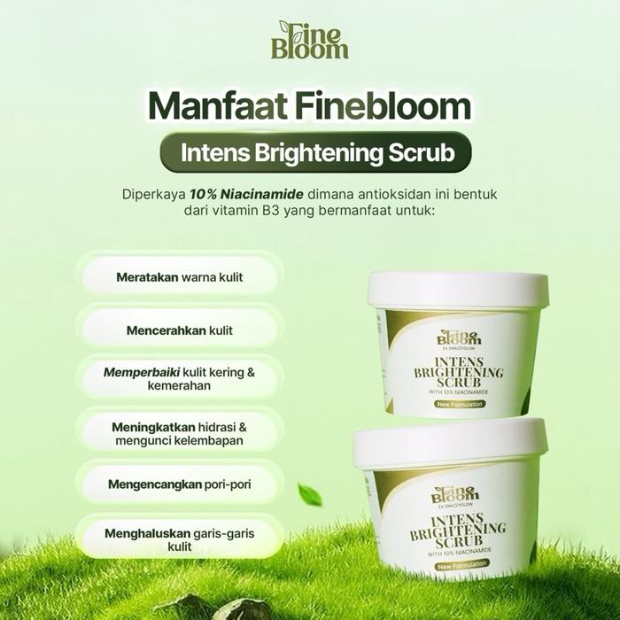 Wujudkan Kulit Cerah, Lembap, dan Sehat Secara Alami! Finebloom Intens Brightening Scrub adalah solusi perawatan tubuh terbaik yang diformulasikan khusus dengan 10% Niacinamide untuk mengeksfoliasi dan mencerahkan kulit tangan, kaki, dan seluruh badan. Aman bahkan untuk kulit sensitif.