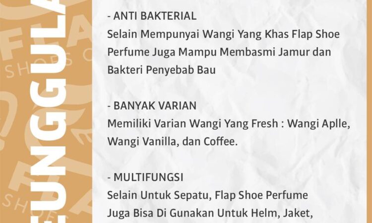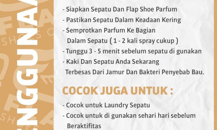 FLAP SHOES PERFUME adalah solusi praktis dan efektif untuk mengatasi bau sepatu sekaligus membunuh bakteri dan jamur. Dengan formulasi essensial oil dan antiseptic, produk ini tidak hanya memberikan aroma segar tahan lama tetapi juga menjaga kebersihan sepatu dari mikroorganisme penyebab bau. Cocok untuk aktivitas sehari-hari maupun perawatan laundry sepatu.