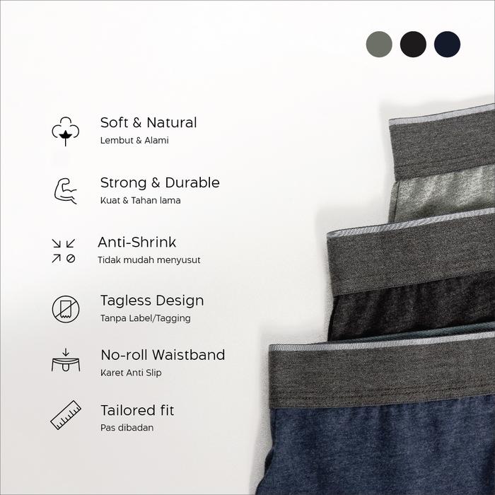- No-Roll Waistband: Teknologi karet pinggang yang dirancang tidak menggulung atau melorot saat digunakan.