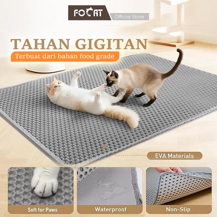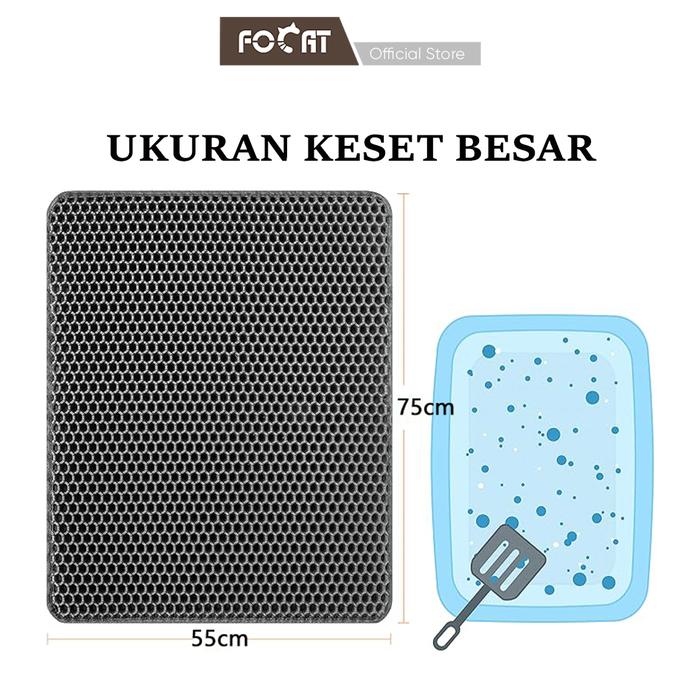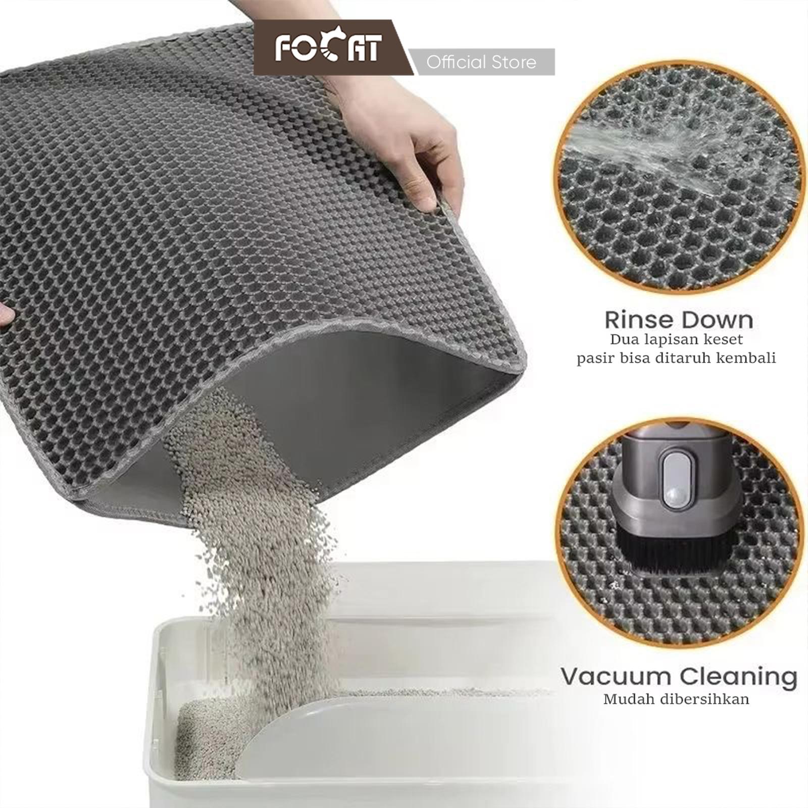 Keset pasir kucing (M51-M53) FOCAT hadir dengan teknologi dua lapisan (double layer) yang efektif menangkap pasir yang menempel di kaki kucing setelah keluar dari litter box. Pasir akan jatuh ke lapisan bawah sehingga lantai tetap bersih dan rapi! Mulut keset bisa dibuka dan didesain lebar, sehingga pasir atau kotoran yang tertampung di dalam bisa mudah dikeluarkan. Pinggiran keset dijahit dan dilengkapi perekat (hook and loop) sehingga pasir tertampung dengan baik dan tidak mudah tercecer keluar.