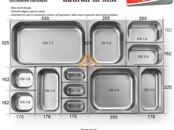 | Ukuran Lain | Tinggi 10cm, 15cm; Ukuran pan: 1/1, 1/2, 1/3, 1/6, 1/9 + tutup available |