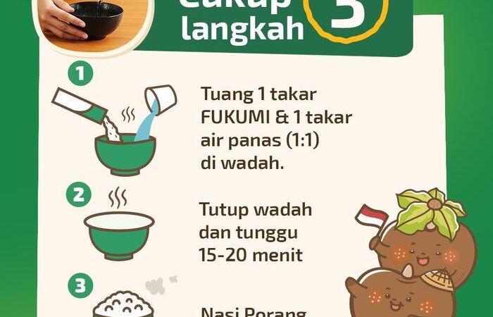 | 1 | Tuang 1 sachet/sendok takar FUKUMI ke mangkok | Gunakan mangkok stainless steel/kaca |