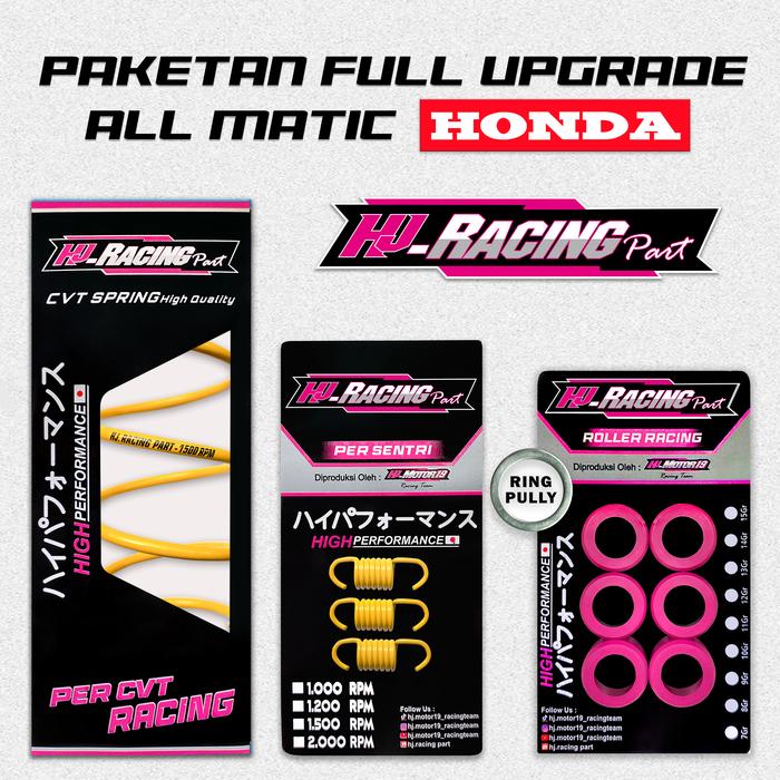 Paket full upgrade CVT Hj.Racing dirancang khusus untuk meningkatkan performa motor matic Honda Anda secara menyeluruh. Paket ini terdiri dari 5 komponen premium yang bekerja sinergis untuk memberikan akselerasi lebih cepat, respons lebih halus, dan efisiensi transmisi yang lebih baik.