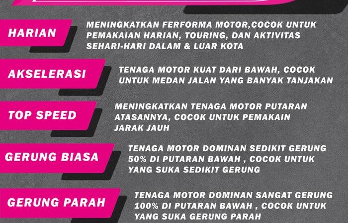 | Per CVT | Meningkatkan responsivitas pully, mengurangi gesekan transmisi, akselerasi lebih enak | 1000 RPM, 1200 RPM, 1500 RPM, 2000 RPM |