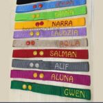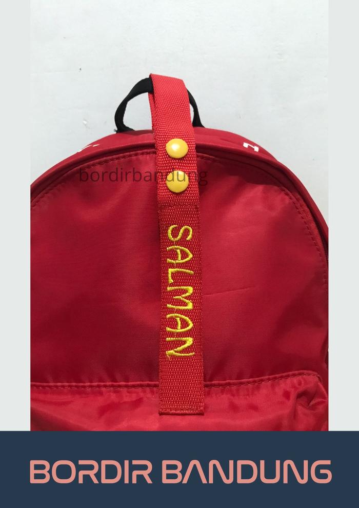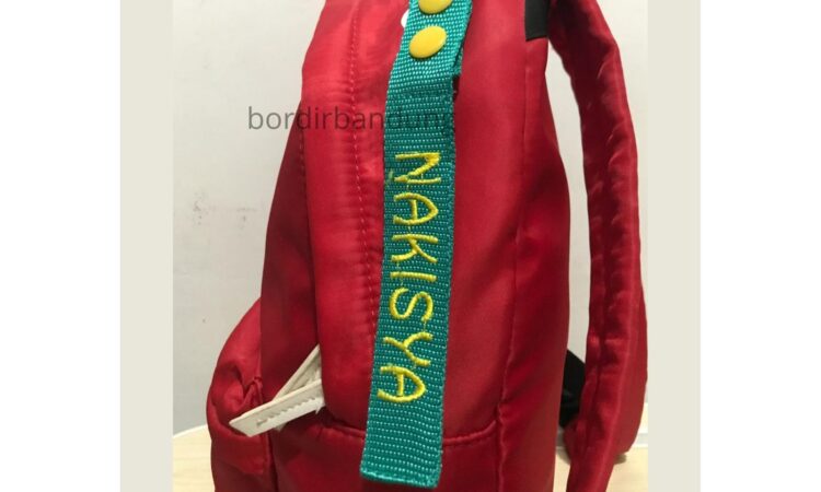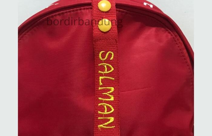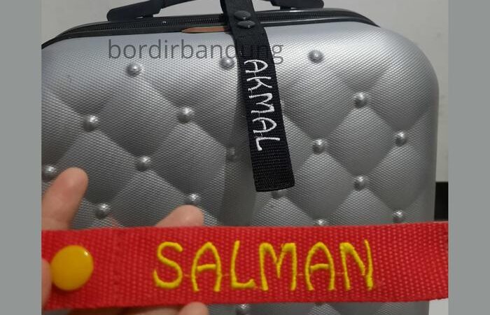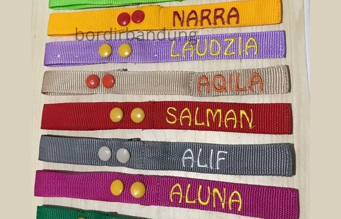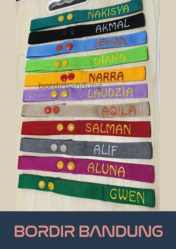 • Bordir: Seni menghias kain dengan membuat pola dan gambar menggunakan benang. Dalam konteks ini, teknik ini digunakan untuk menuliskan nama pada tag.