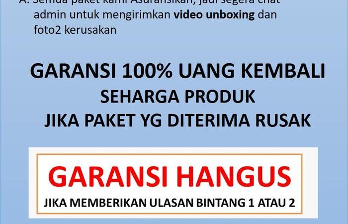 Garansi Kepuasan: 99% paket kami tiba dalam keadaan aman. Jika produk rusak, Anda dapat langsung mengajukan pengembalian dana. Segera hubungi admin dan kirimkan bukti kerusakannya.