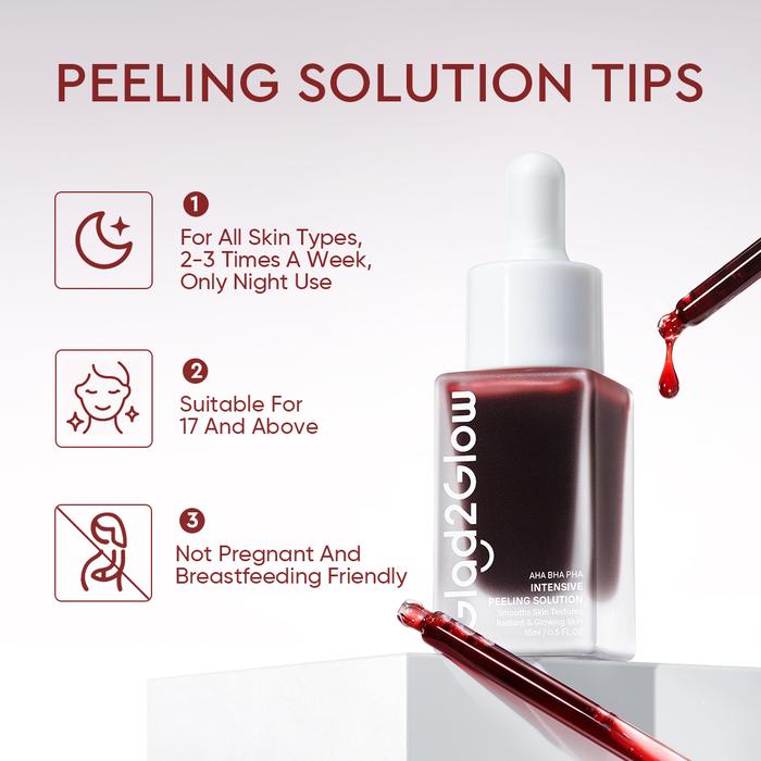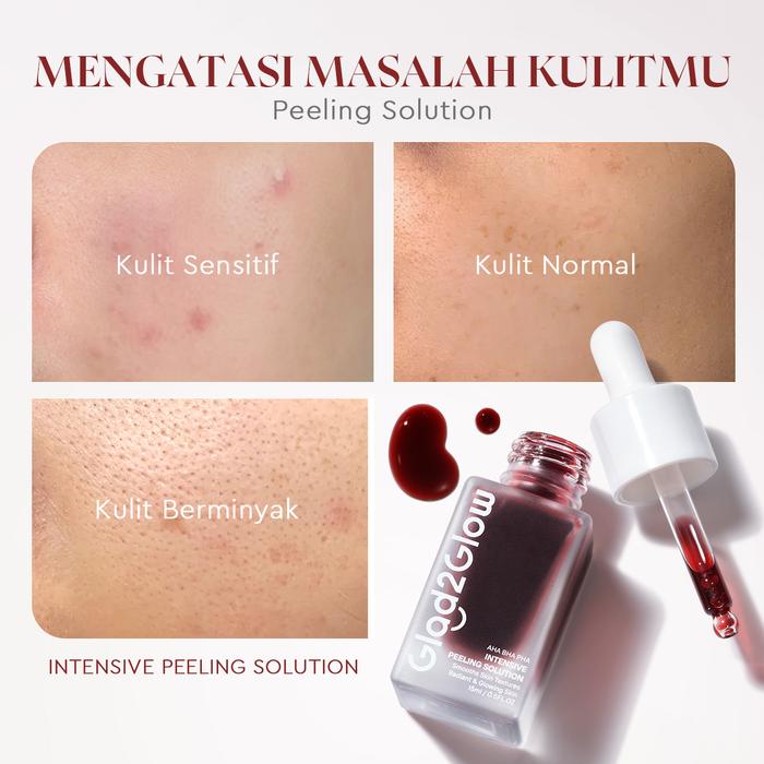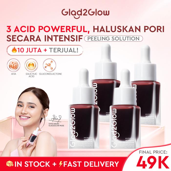 GLAD2GLOW AHA BHA PHA Intensive Peeling Solution adalah serum eksfoliasi berbasis air yang diformulasikan dengan kombinasi AHA, BHA, dan PHA untuk mengatasi berbagai masalah kulit seperti kusam, tekstur kasar, pori-pori besar, jerawat, dan bekas jerawat. Formula ini bekerja efektif untuk mengangkat sel kulit mati, mencerahkan wajah, serta memperbaiki kesehatan kulit secara menyeluruh.