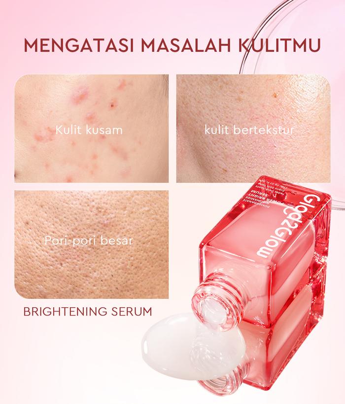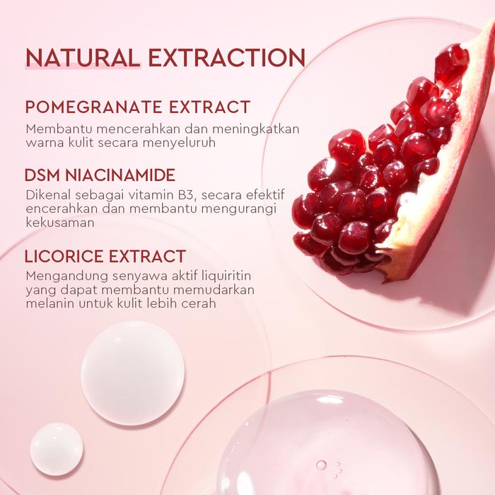 Serum pencerah dengan tekstur ringan dan cepat menyerap, diformulasikan untuk penggunaan harian. Mengandung 10% Niacinamide, Pomegranate (Delima), dan Alpha Arbutin yang bekerja sinergis untuk: