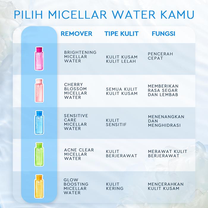 • Micellar Water: Cairan pembersih wajah yang mengandung micelles (partikel pembersih mini) untuk menarik dan mengangkat kotoran, minyak, serta makeup tanpa mengiritasi kulit.