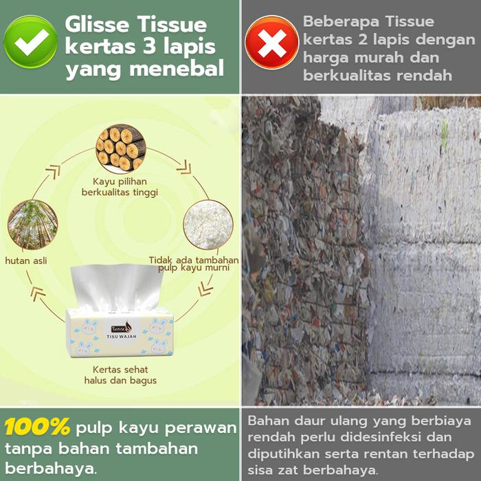 Nikmati kualitas premium dengan harga terjangkau! Tisu wajah Glisse diproses secara higienis tanpa bahan kimia berbahaya seperti zat pembersih atau pemutih, sehingga sangat aman untuk semua jenis kulit, bahkan kulit sensitif sekalipun. Dapatkan sekarang dengan promo spesial dan kemasan baru yang lebih praktis.
