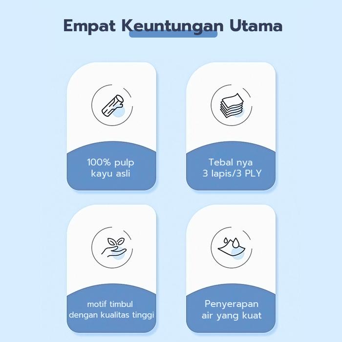 - 3-Ply (3 Lapis): Tisu terdiri dari tiga lapisan lembaran yang disatukan. Desain ini memberikan kekuatan, daya serap, dan kelembutan yang jauh lebih unggul dibandingkan tisu 1 atau 2 lapis.