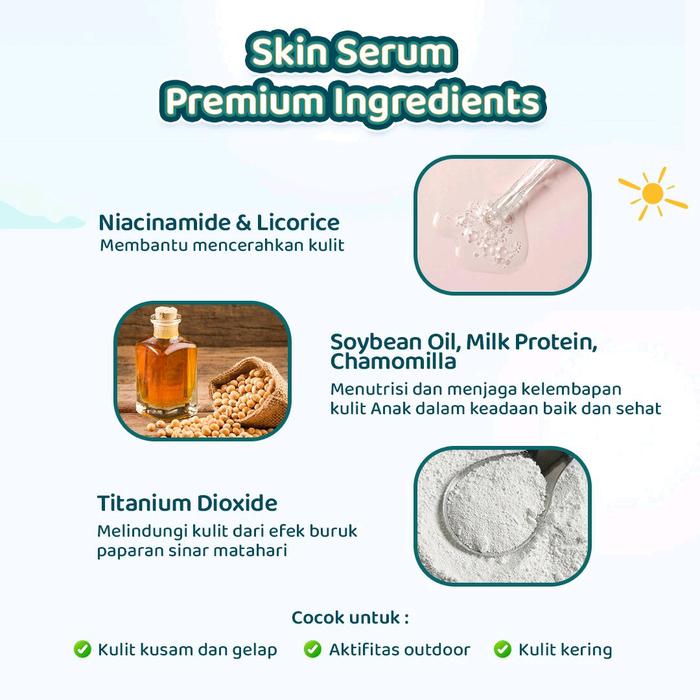 Manfaat lengkap serum ini antara lain membantu menjaga kelembapan alami kulit, melindungi dari sengatan matahari, serta membuat tekstur kulit tampak lebih halus dan sehat. Teksturnya sangat ringan, tidak lengket, dan cepat menyerap sempurna sehingga nyaman untuk digunakan sehari-hari pada wajah dan seluruh tubuh (hindari area mata). Aman digunakan sejak bayi usia 0+ hingga anak-anak. Untuk hasil terbaik, gunakan secara rutin.