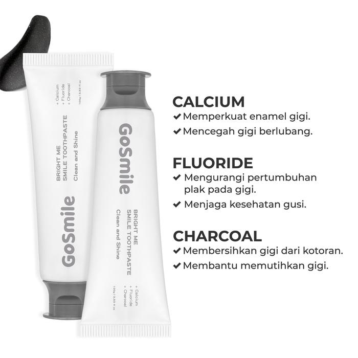 Tampilkan senyum terpercaya diri Anda dengan Go Smile Bright Me Smile Charcoal Toothpaste. Pasta gigi inovatif ini menggabungkan kekuatan kalsium dan fluoride untuk memperkuat enamel gigi serta melindungi dari risiko kerusakan. Dibuat dengan formula activated charcoal (arang aktif) yang terkenal mampu mengangkat noda membandel di permukaan gigi secara efektif, membantu memutihkan gigi hanya dalam beberapa minggu pemakaian.