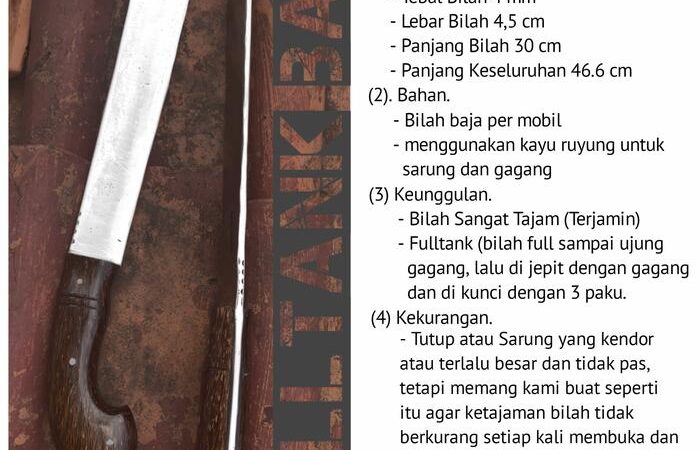 - Full Tang (Fulltank): Konstruksi pisau atau golok di mana bilah bajanya menyatu dan memanjang hingga membentuk seluruh gagang. Ini memberikan kekuatan dan keseimbangan yang jauh lebih unggul dibandingkan bilah yang hanya ditancapkan ke gagang.