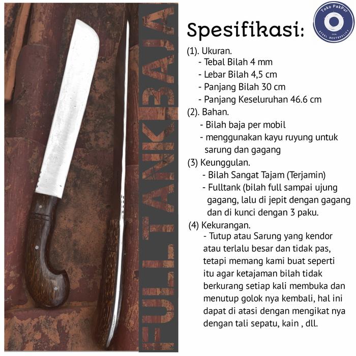 | Sambungan nya kuat kak? | Sangat kuat. Menggunakan sistem full tang dengan 3 pin paku, jauh lebih kokoh dibandingkan golok biasa yang hanya ditancap (puncuk). |