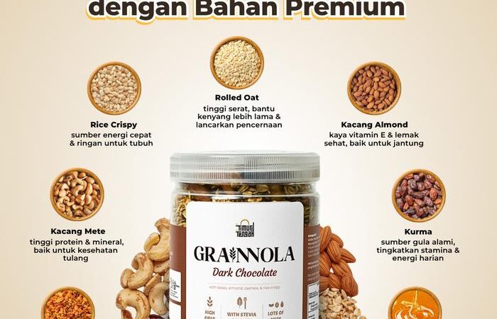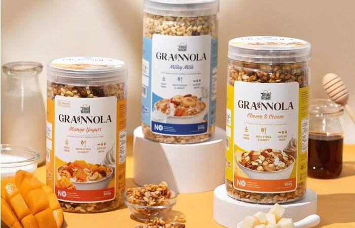 • Grainnola: Merupakan permainan kata dari “grain” (biji-bijian) dan “granola”. Produk ini adalah sereal yang terbuat dari oat, kacang-kacangan, biji-bijian, dan buah kering yang dipanggang, seringkali dengan tambahan pemanis alami seperti madu.