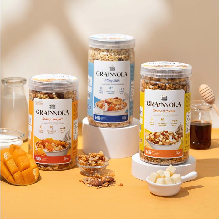 • Grainnola: Merupakan permainan kata dari “grain” (biji-bijian) dan “granola”. Produk ini adalah sereal yang terbuat dari oat, kacang-kacangan, biji-bijian, dan buah kering yang dipanggang, seringkali dengan tambahan pemanis alami seperti madu.