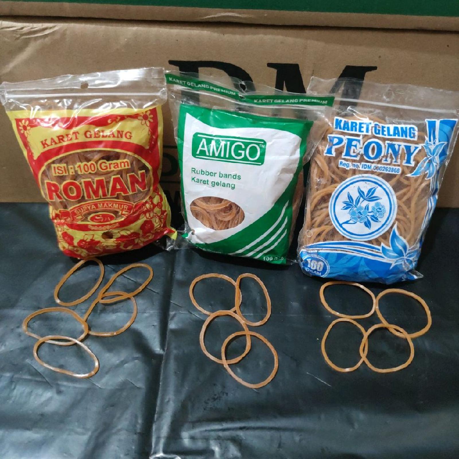 | Amigo | 100 gram | ± 100 pcs | Karet alami, diameter ±4 cm | Kuning cerah |