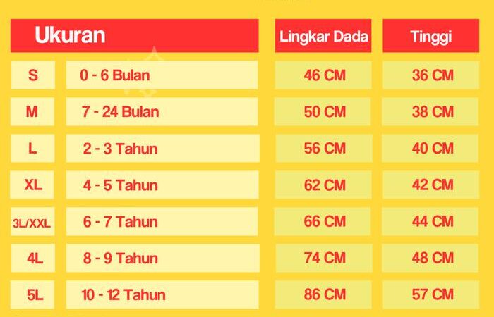 Penting: Usia hanya sebagai patokan. Ukuran dapat berbeda sesuai postur tubuh anak. Untuk anak yang gemuk, disarankan memilih ukuran satu tingkat lebih besar. Pastikan untuk mengukur badan atau pakaian anak yang sedang dipakai untuk hasil yang paling akurat.