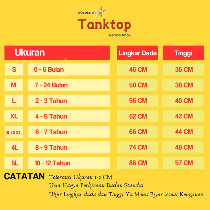 Tampilkan keceriaan si kecil dengan koleksi tanktop renda warna-warni yang nyaman dan adem untuk dipakai sehari-hari. Terbuat dari bahan katun berkualitas tinggi, tanktop ini lembut di kulit dan cocok digunakan sebagai kaos dalam, piyama, atau untuk aktivitas bermain yang menyenangkan. Tersedia dalam paket grosir hemat, baik 6 pcs maupun 12 pcs (1 lusin).