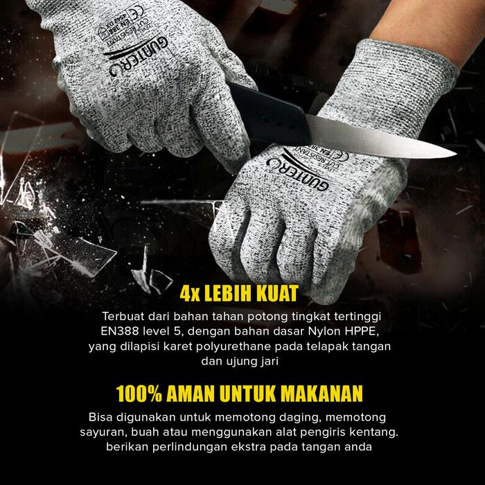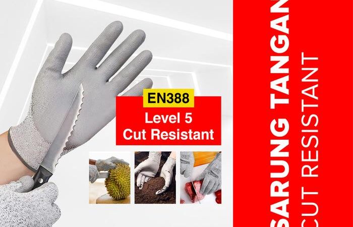 | Material Canggih | Dibuat dengan bahan khusus Cut Resistant yang memberikan perlindungan level 5 terhadap potongan dan tusukan. |