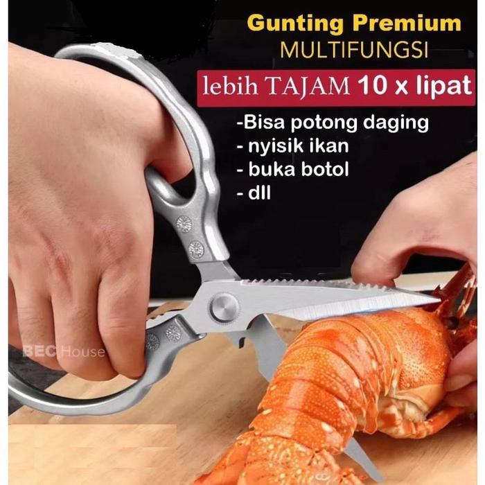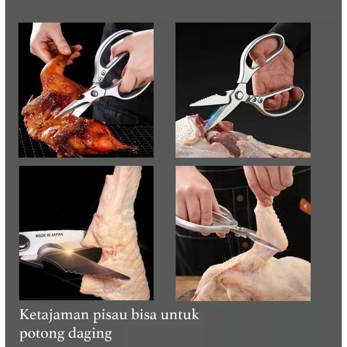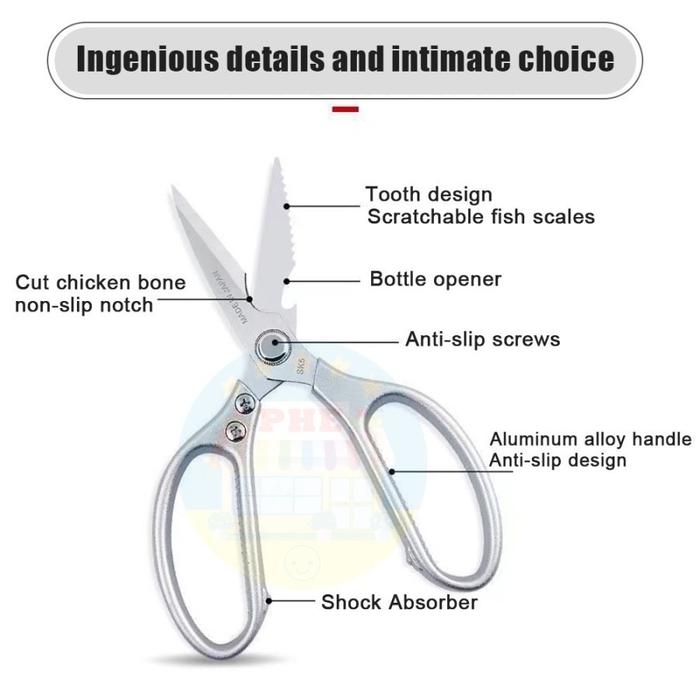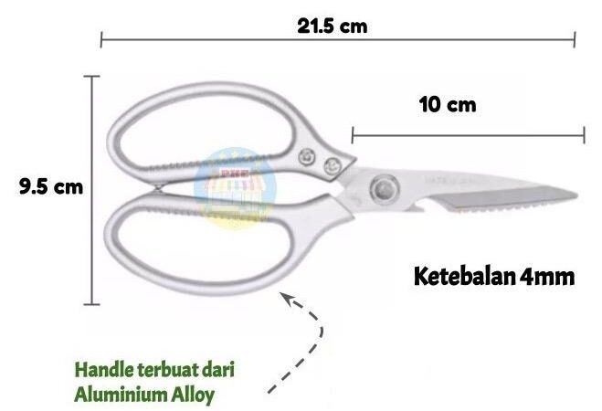 Dengan ketebalan 4mm, gunting ini sangat kuat dan tidak mudah patah. Ideal untuk menggunting tulang ayam, tulang ikan, daging beku, hingga tugas di luar dapur seperti memotong plat seng tipis atau ranting pohon. Gagangnya yang terbuat dari aluminium alloy dirancang ergonomis untuk cengkeraman yang nyaman dan kuat.