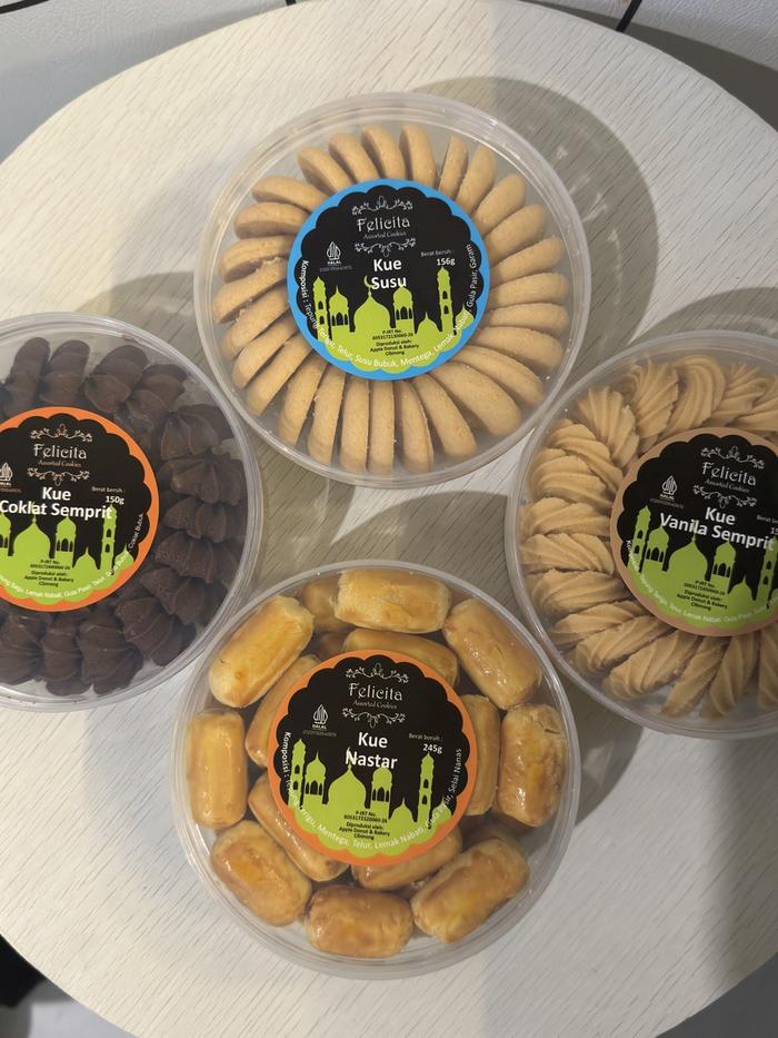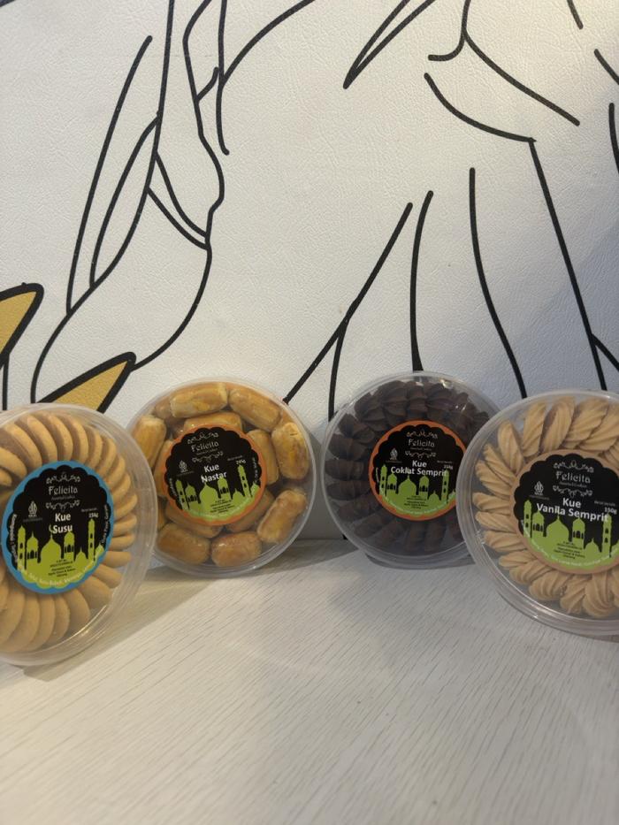 | Felicita 6 Toples | 6 | Hijau | Sagu Keju (180gr), Putri Salju (245gr), Kue Susu (180gr), Coklat Semprit (180gr), Vanilla Semprit (180gr), Nastar (245gr) |