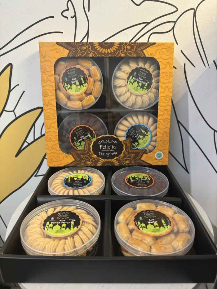 | Felicita 4 – Hijau | 4 | Hijau | Vanila Semprit (180gr), Coklat Semprit (180gr), Putri Salju (245gr), Nastar (245gr) |