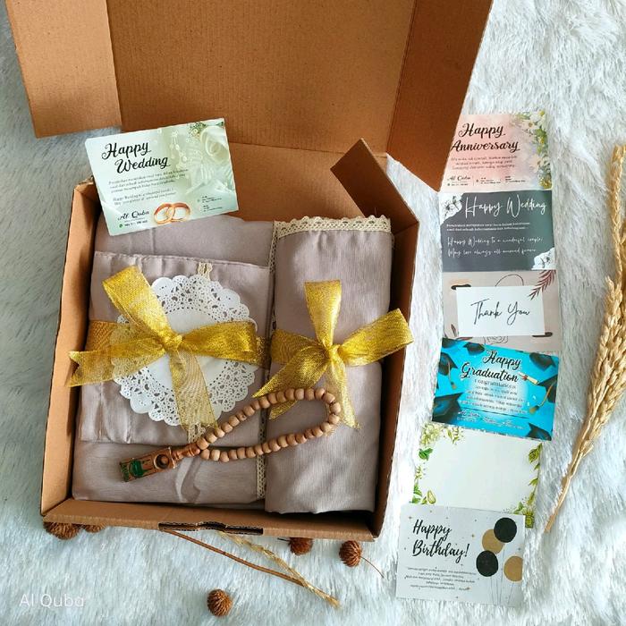 | Isi Hampers | – Mukena travel dewasa – Tasbih 33 butir – Kartu ucapan (opsional: Happy Birthday/Wedding/Graduation/Anniversary) – Box eksklusif |