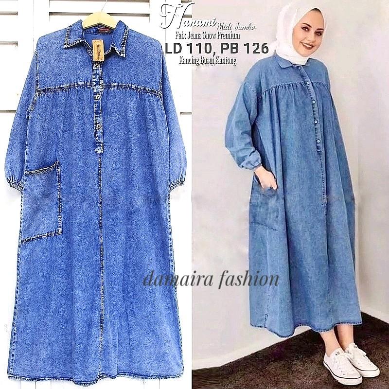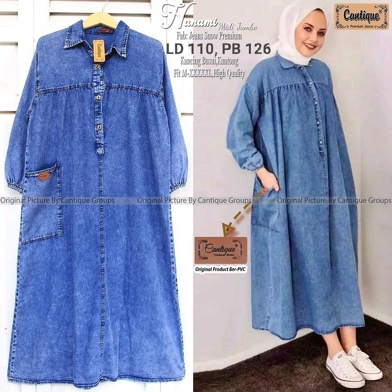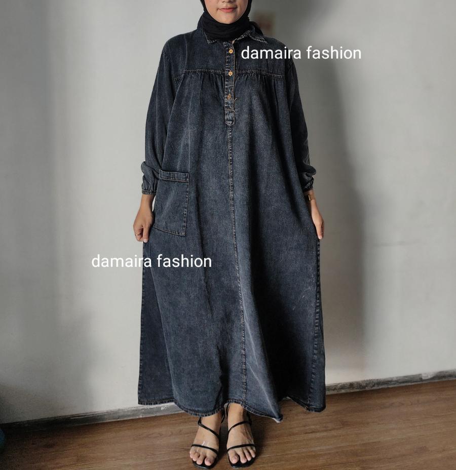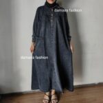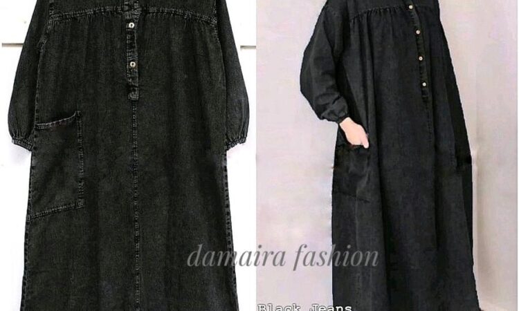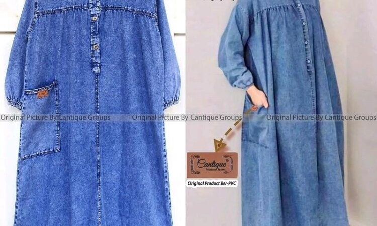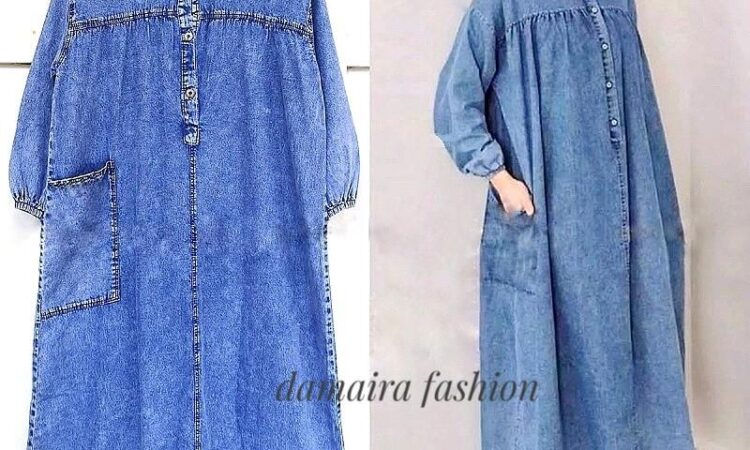 - Desain gamis jeans elegan dengan potongan midi yang sedang tren.