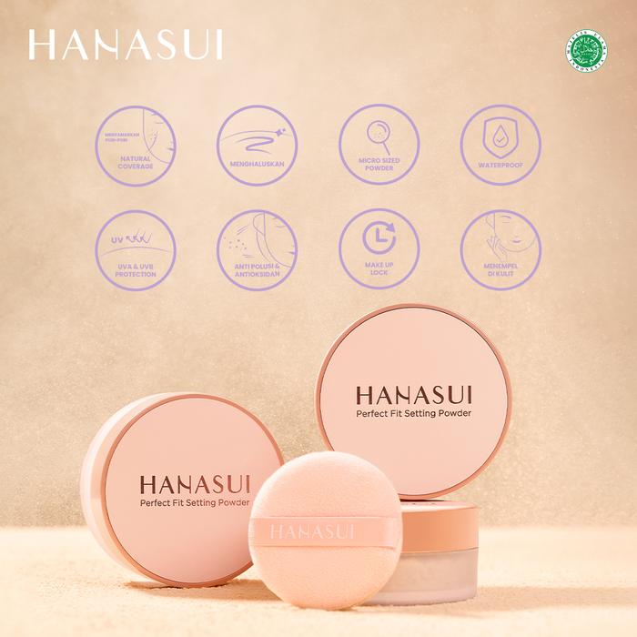 Hanasui Perfect Fit Setting Powder adalah bedak tabur finishing yang halus, ringan, dan mudah menyatu dengan kulit. Dirancang untuk mengunci riasan sekaligus memberikan perlindungan terhadap minyak berlebih, sinar UV, dan polusi. Dengan partikel light-reflecting, bedak ini menciptakan efek soft focus yang menyamarkan pori-pori, garis halus, dan kerutan untuk tampilan alami sempurna. Dilengkapi dengan vitamin E sebagai antioksidan dan Phytessence™ Peach Flower untuk perlindungan tambahan terhadap polusi.