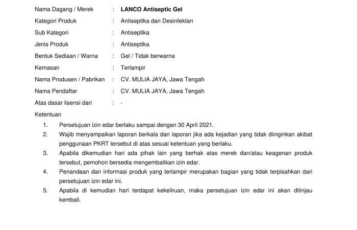| Lanco Gel | Gel | PKD 20501021071 | 70% Ethyl Alkohol, Aqua Demin, H₂O₂, Chlorhexidine Gluconate, Propylene Glycol, Active Gel | Ocean Fresh | Blue Ocean |