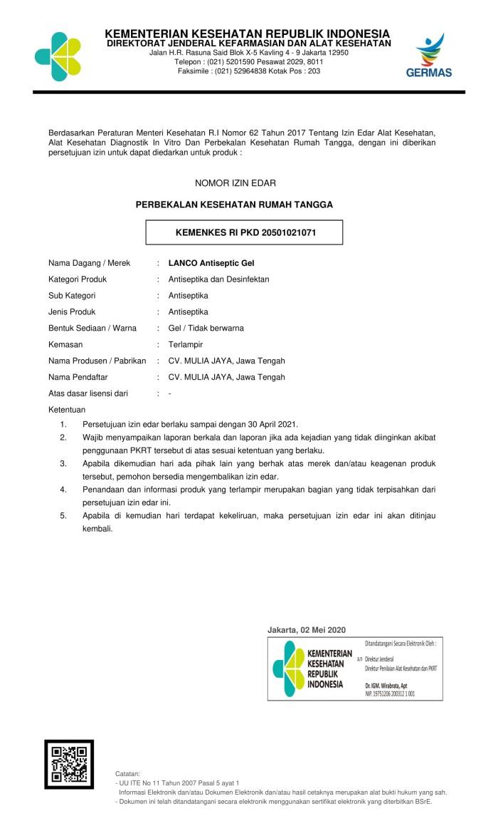 | Lanco Gel | Gel | PKD 20501021071 | 70% Ethyl Alkohol, Aqua Demin, H₂O₂, Chlorhexidine Gluconate, Propylene Glycol, Active Gel | Ocean Fresh | Blue Ocean |