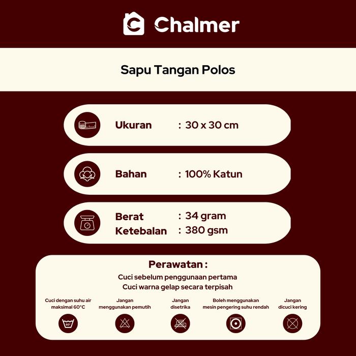 Hadirkan kenyamanan dalam setiap sentuhan dengan Handuk Chalmer Classic berukuran 30×30 cm. Handuk serbaguna ini sangat cocok digunakan sebagai handuk wajah, lap tangan, atau bahkan sapu tangan yang stylish. Dibuat dari bahan terry cotton 100% berkualitas medium (380 gsm), handuk ini menjamin daya serap air yang luar biasa dan kelembutan yang tahan lama. Dengan berat hanya sekitar 34 gram per buah, handuk ini praktis untuk dibawa ke mana saja.